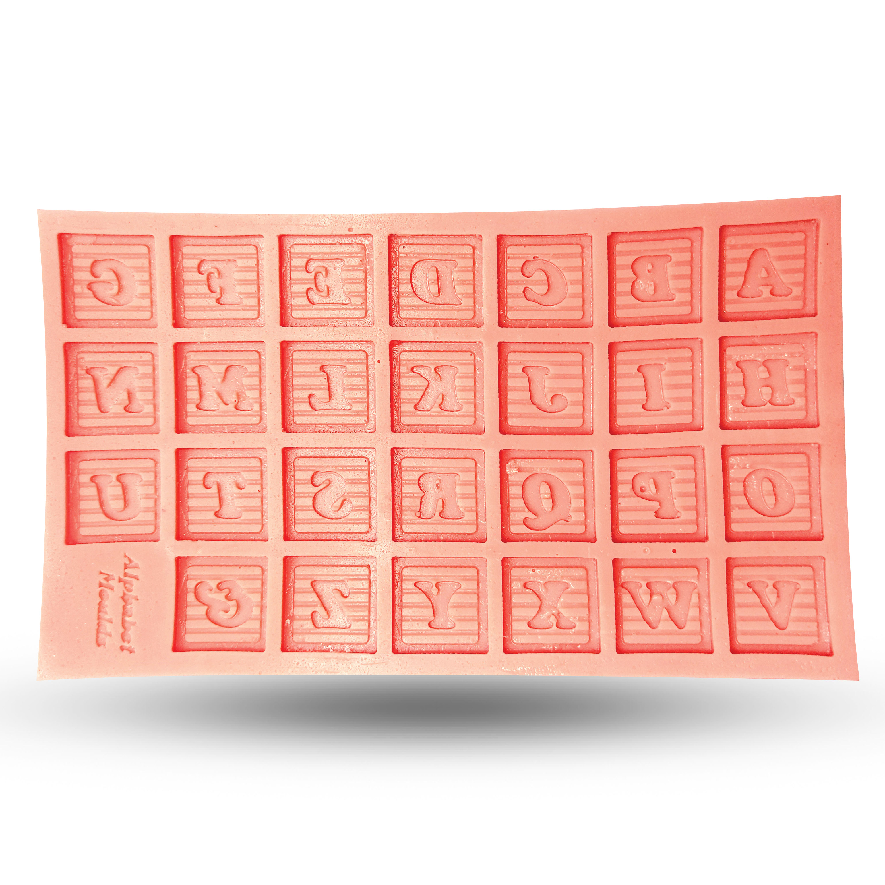 طراحی دقیق و متقارن – این قالب شامل مجموعهای از حروف درون قابهای مربعی است که روی فوندانت، مارزیپان یا خمیر شکلاتی نقش میبندد.