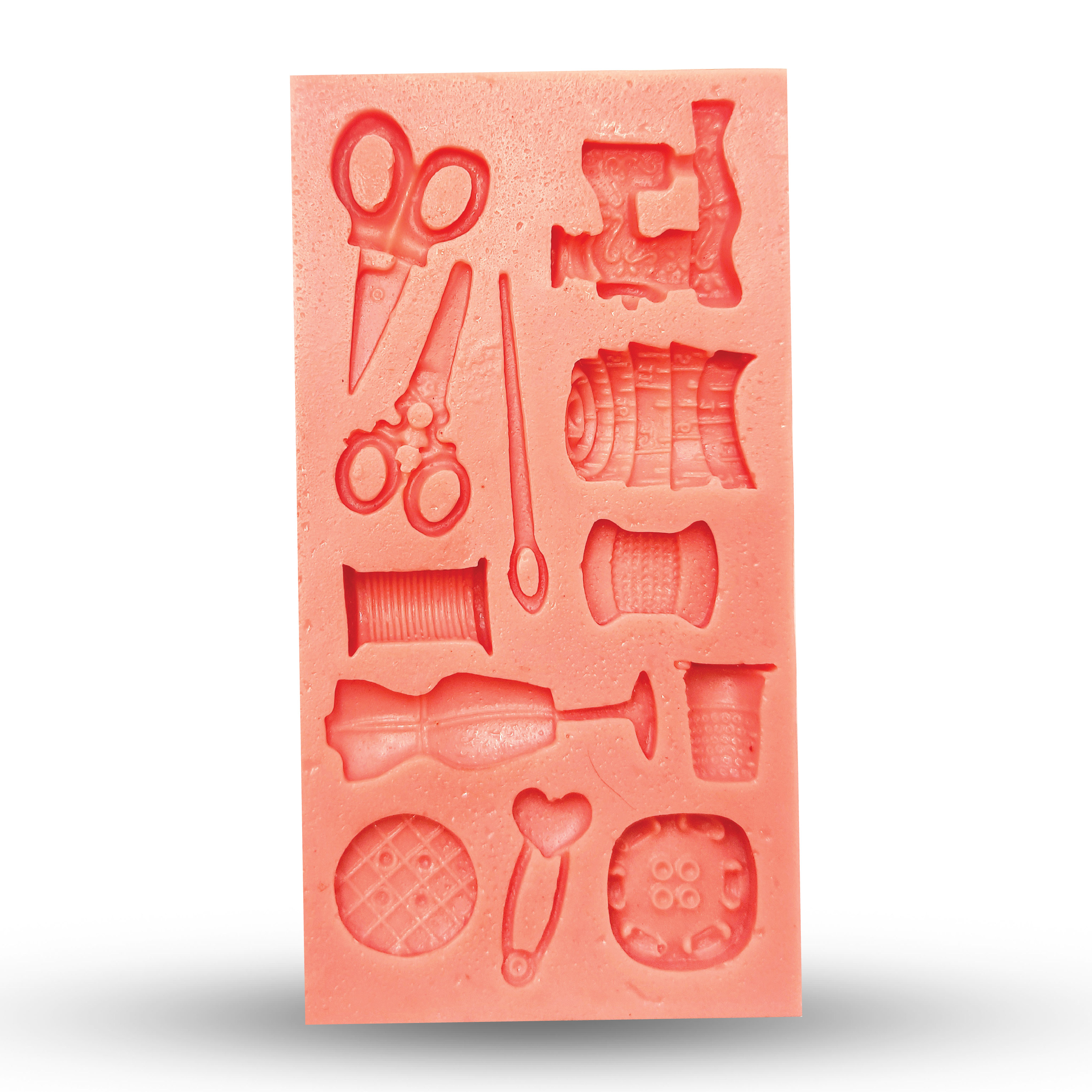 طراحی دقیق و جذاب – این قالب شامل جزئیات ابزارهایی مانند نخ، سوزن، قیچی، دکمه و سایر وسایل خیاطی است که روی فوندانت، مارزیپان یا خمیر شکلاتی نقش میبندد.