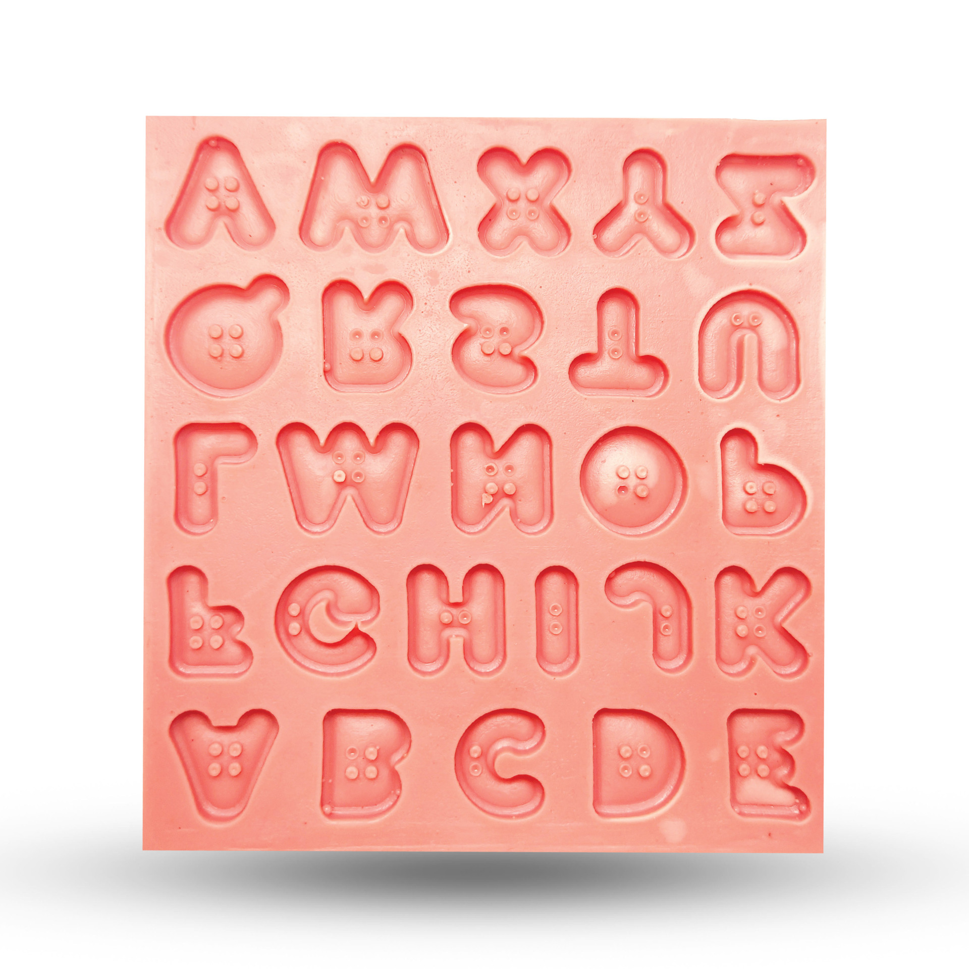 طراحی شیک و منحصربهفرد – این قالب شامل مجموعهای از حروف که درون دکمههای ظریف قرار گرفتهاند، روی فوندانت، مارزیپان یا خمیر شکلاتی نقش میبندد.